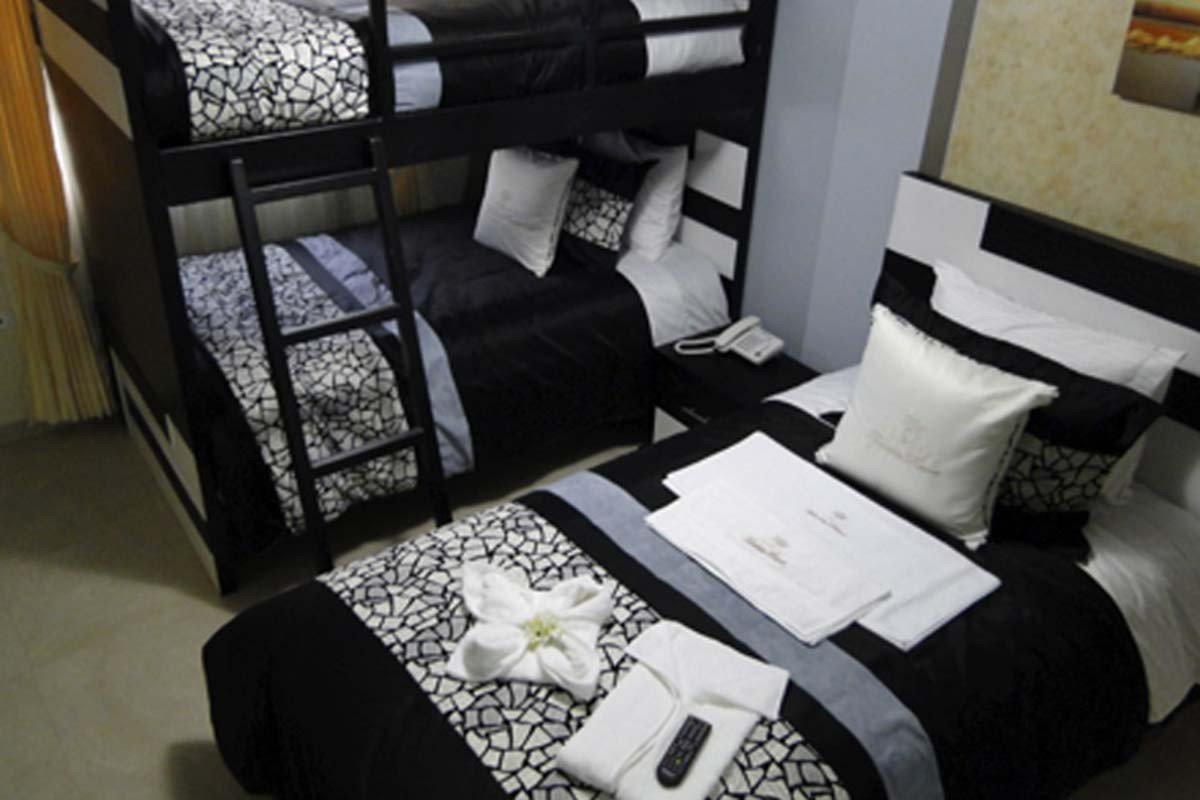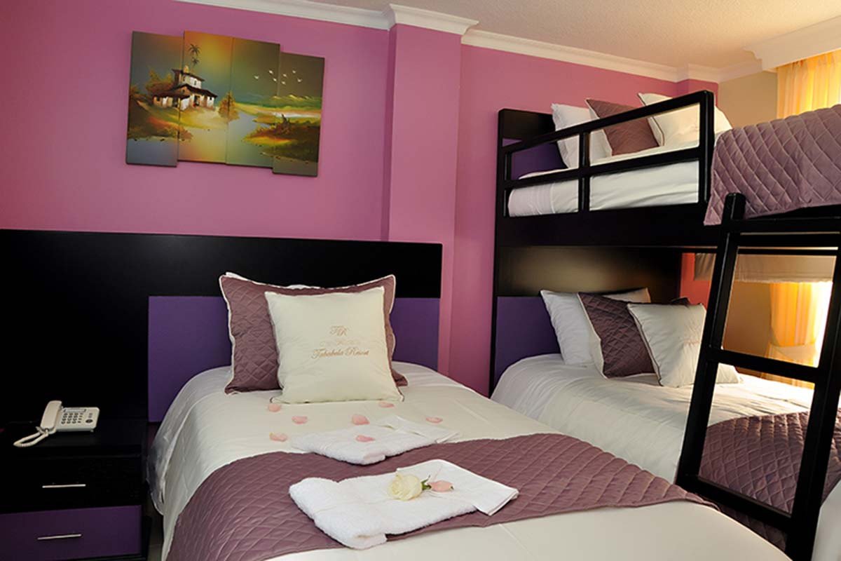 Habitación con una litera de 1 ½ y una cama de 1 ½, con colchones antiácaros, TV por cable, wi-fi, agua caliente, led de 32 pulgadas, sábanas hoteleras 100% algodón, cobija térmica, douvet de bramante y plumón interno, dos almohadas de plumón, un cojín decorativo, armario, dos veladores, caja fuerte, teléfono, detector de humo, baño individual, secador de cabello, accesorios de aseo personal.